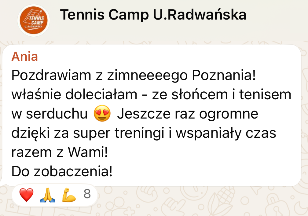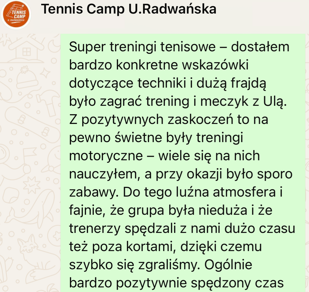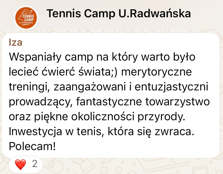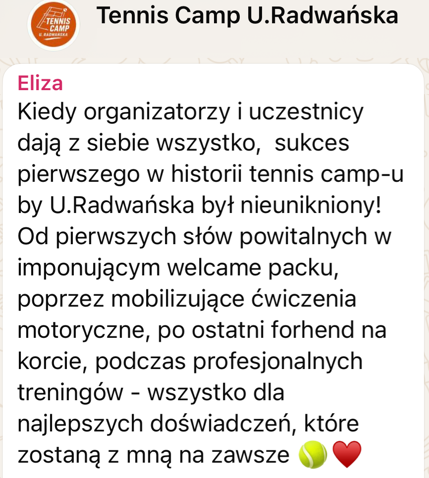 Wyślij do nas wiadomość z informacją, że chcesz wziąć udział w „Tennis Camp by U. Radwanska„, a my prześlemy Ci ofertę.