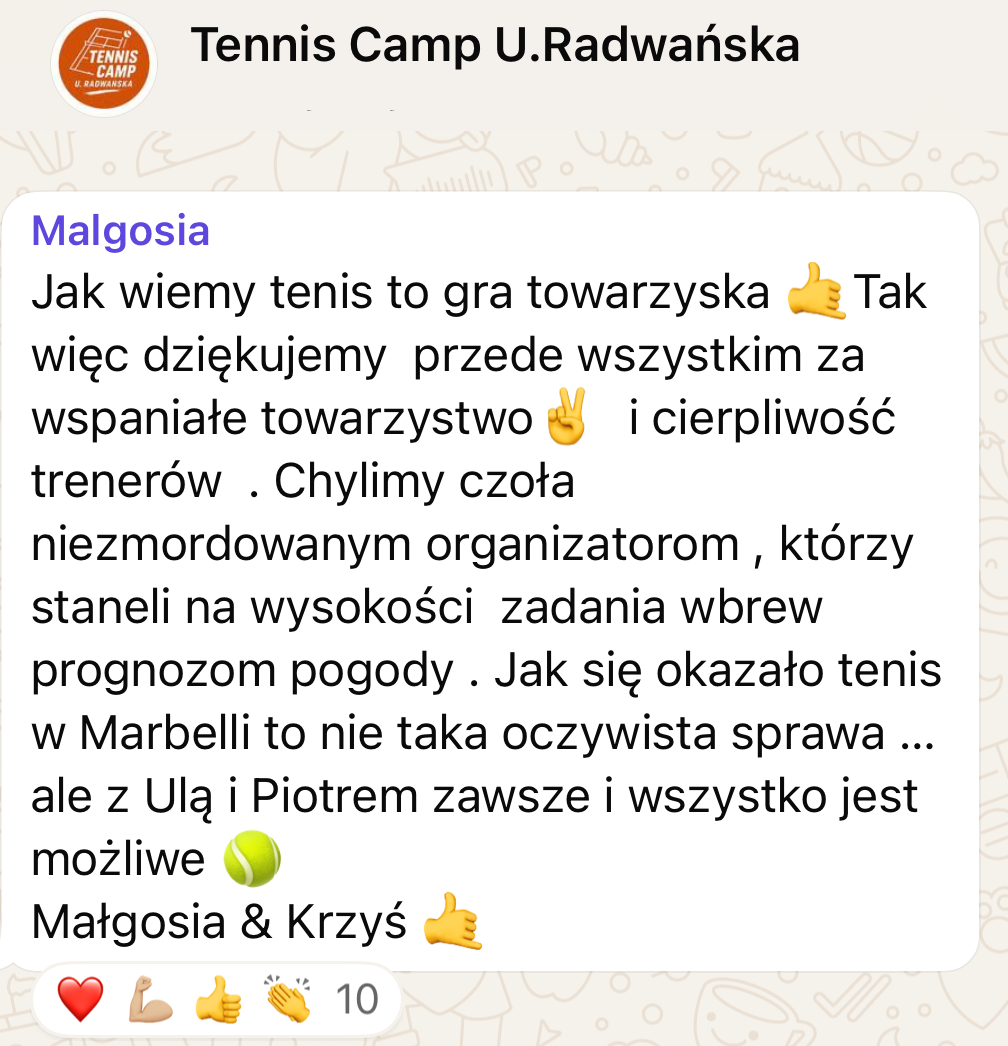 Już 20-stego kwietnia zapraszamy Was do Marbelli, gdzie razem z Urszulą Radwańską będziemy trenować, odpoczywać i cieszyć się hiszpańskim klimatem. Profesjonalne treningi, świetna ekipa i niezapomniane chwile – tego nie da się opisać, to trzeba przeżyć!